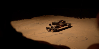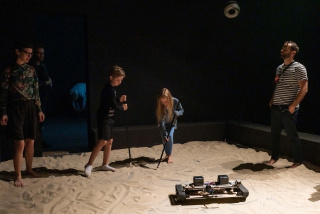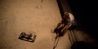 Each individual who enters into the exhibition space contributes to the work’s evolution. Emerging from a room comprising audio and visual components, visitors find themselves in the midst of a large sandbox where a robot continuously reforms the terrain while driving over and writing Hebrew letters in the sand. Custom-made tools are scattered around the sandbox, which the visitors are invited to use to reform and flatten the terrain, preparing further surfaces for the robot’s calligraphic activities. Hundreds audio recordings of vocalized Hebrew letters comprise the generative and electronically shaped soundtrack. Each vocal fragment has been composed individually, yet these gestural materials converge in continuously varying densities, forming a rich, ever-changing soundscape projected over 10 speakers in the space. Depending on their movement, visitors may hear a single whispering voice or an assemblage of vocal gestures. A live visualization of visitors’ movements inside the sandbox is projected on a large, transparent screen hung at the back of the space. This animated representation reflects the movement and interactions in the exhibition and, along with the robotic and audio components, offers a stylized perspective on the social relations occurring between individuals and within groups.