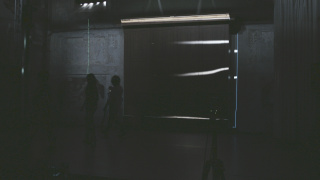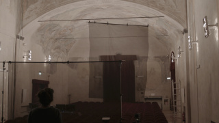 The installation comprised three projectors, each assigned one of three different visualizations that are projected on three large, transparent black screens hung in the exhibition space. This approach is a direct outgrowth of practices in recent works exploring the layering of materials and using transparency and light as artistic materials. The projected images were thus visible from both sides as well as beyond the screens on the frescoed walls of Casa Paganini’s auditorium.